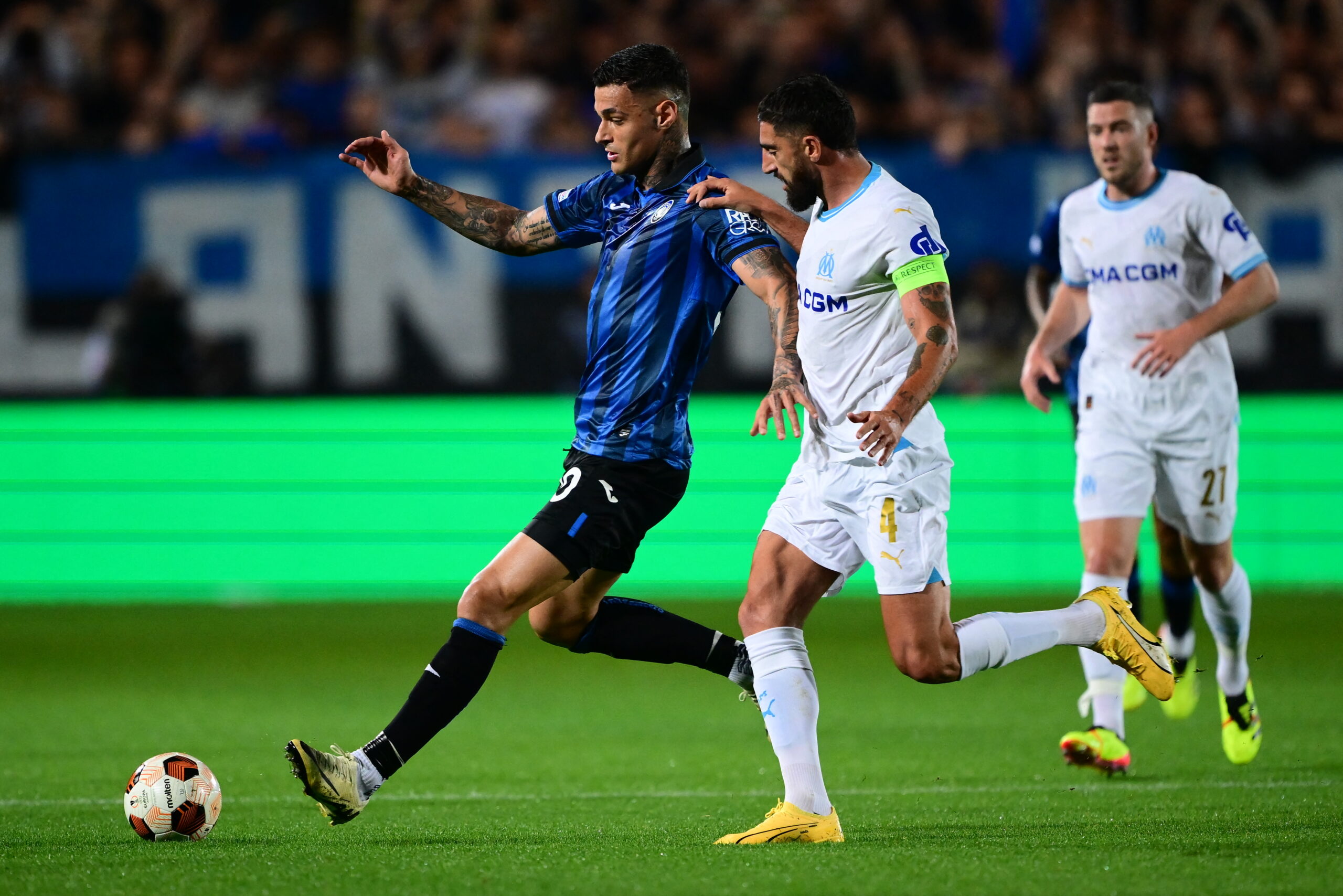 Atalanta's Italian forward #90 Gianluca Scamacca (L) controms the ball during the UEFA Europa league second leg semi-final between Atalanta and Marseille at Bergamo's stadium on May 9, 2024. (Photo by Marco BERTORELLO / AFP)