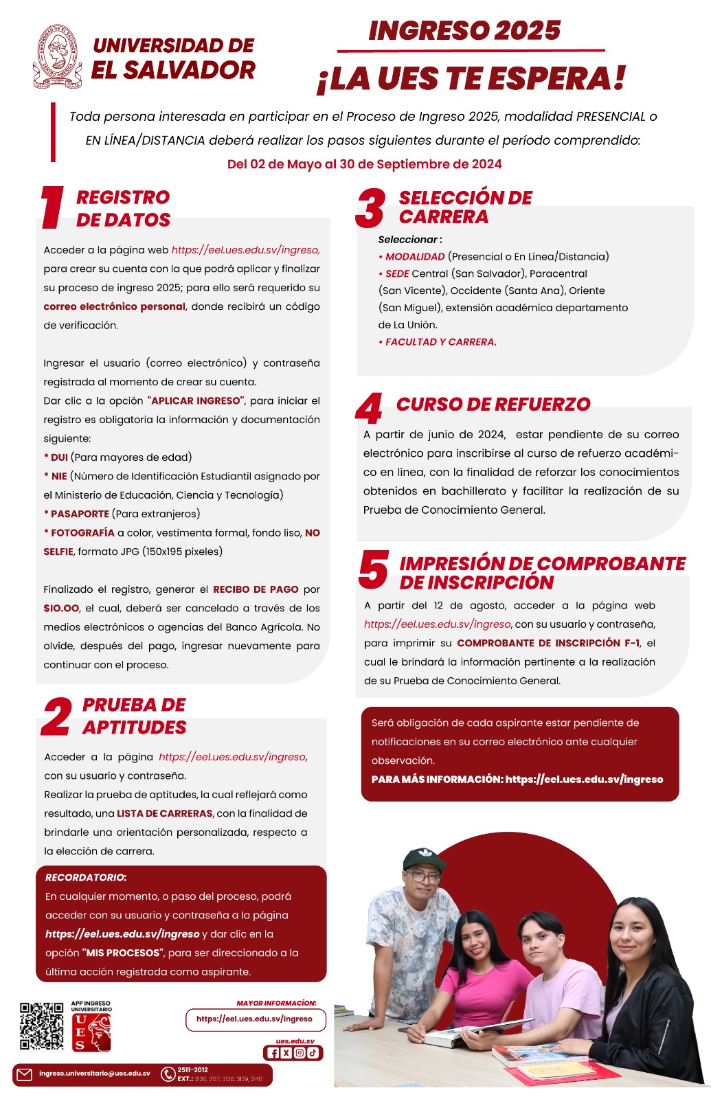 Los interesados pueden obtener más información y comenzar su proceso de inscripción visitando: https://eel.ues.edu.sv/ingreso. Por otra parte, pueden hacer consultas al correo: ingreso.universitario@ues.edu.sv o al teléfono: 2511-2012
