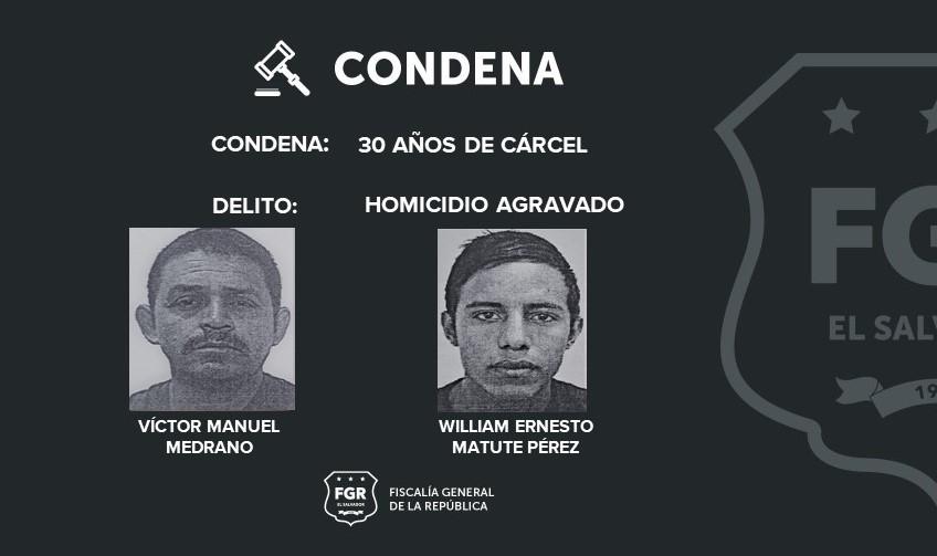 La Fiscalía General de la República (FGR), informó la condena de 30 años para los pandilleros Víctor Manuel Medrano y William Ernesto Matute, debido a cometer un asesinato a una persona en julio de 2021.