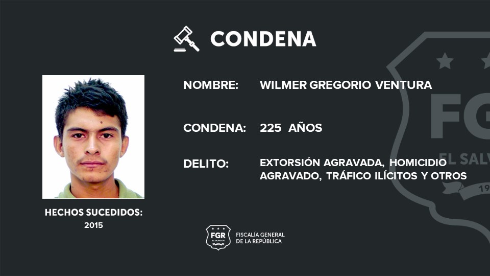 “La FGR logró condenas de hasta 225 años de cárcel para estos tres pandilleros que operaban en el departamento de La Unión. Las investigaciones indicaron que estos sujetos participaron en aproximadamente 110 delitos entre noviembre de 2015 y marzo 2016”, dijo la Fiscalía.