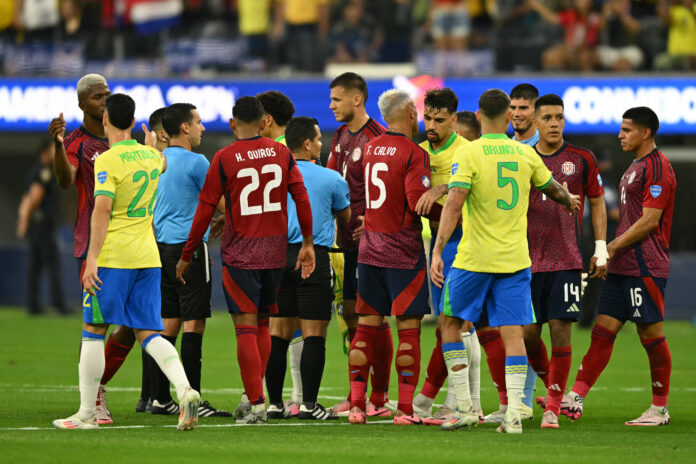 Players shake hands after the Conmebol 2024 Copa America tournament group D football match between Brazil and Costa Rica at SoFi Stadium in Inglewood, California on June 24, 2024. (Photo by Patrick T. Fallon / AFP)
