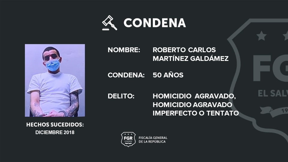 “El pandillero Roberto Martínez fue condenado a 50 años de cárcel por quitarle la vida a dos personas e intentar asesinar a una tercera víctima”, dijo la FGR.