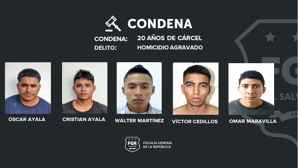 Los condenados son: Óscar Antonio Ayala Díaz; Cristian Lorenzo Ayala Díaz; Walter Alexander Martínez Menjívar; Víctor Antonio Quintanilla Cedillo y Omar Alexis Quintanilla Cortez.