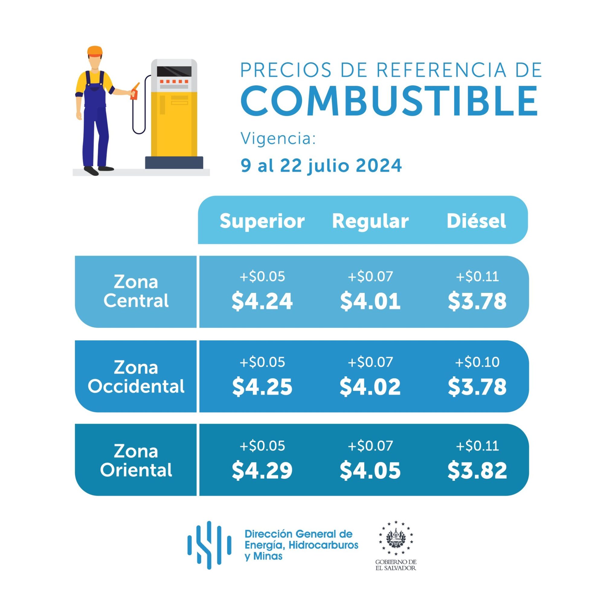 La Dirección General de Energía, Hidrocarburos y Minas (DGEHM), anunció por medio de redes sociales sobre el precio de referencia de los Combustibles de El Salvador validos desde el 9 hasta el 22 de julio.