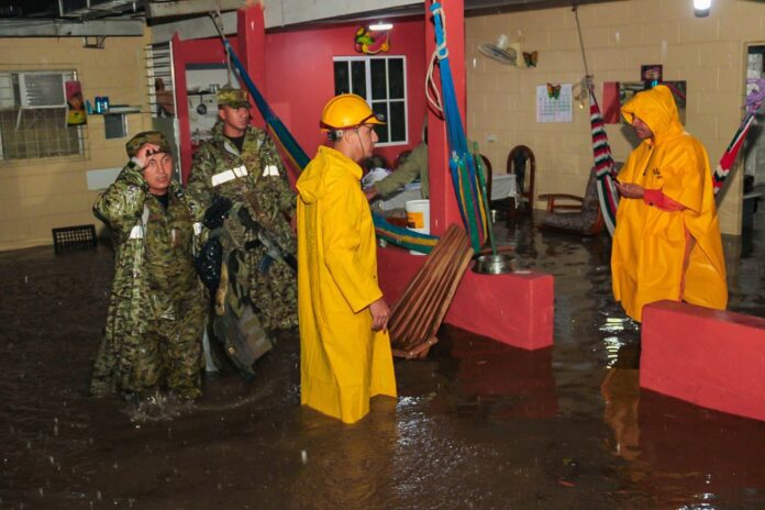 “En coordinación con otras instituciones, evacuamos a 10 personas del cantón San Diego, La Libertad Costa, debido a las inundaciones en la zona a causa de las fuertes lluvias”, manifestó la Fuerza Armada.