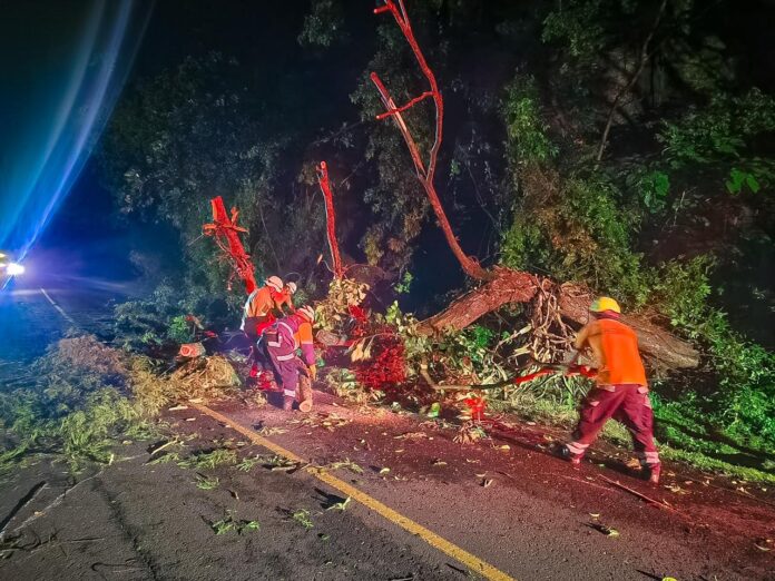 “En horas de la madrugada nuestro #EquipoTácticoOperativo junto con Bomberos realizaron remoción de árbol caído que obstaculizaba la vía. Kilómetro 8, carretera que del distrito de Atiquizaya conduce hacia el distrito de San Lorenzo, Ahuachapán Norte”, dijo PROCIVIL.