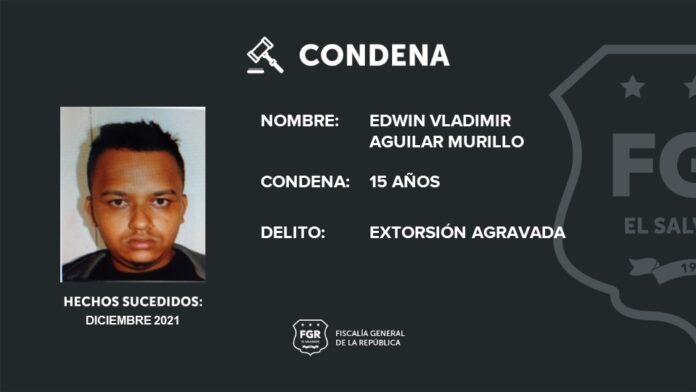 “Edwin Aguilar fue condenado a 15 años de cárcel por el delito de extorsión agravada. Este sujeto interceptó a su víctima, lo amenazó de muerte y le exigió el pago de $5,000 dólares. La víctima únicamente pudo entregarle $300 dólares”, dijo la FGR.