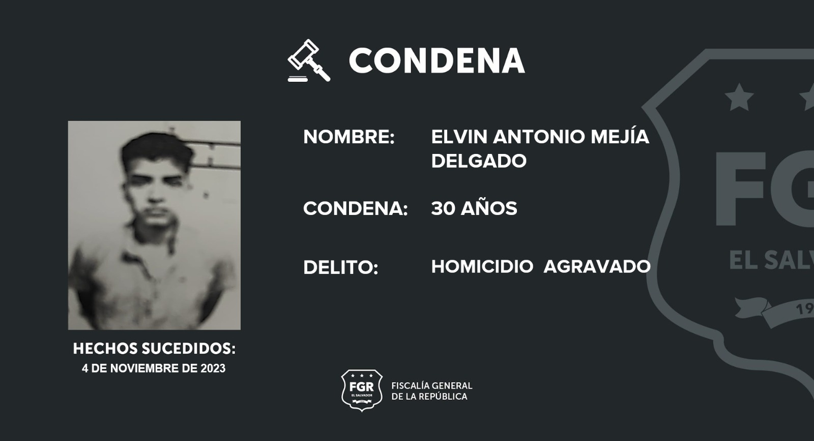 La Fiscalía General de la República (FGR), anunció la condena de Elvin Antonio Mejía Delgado a 30 años de cárcel, por asesinar a su padre, en el distrito de Cuscatlán ocurrido en noviembre de 2023.