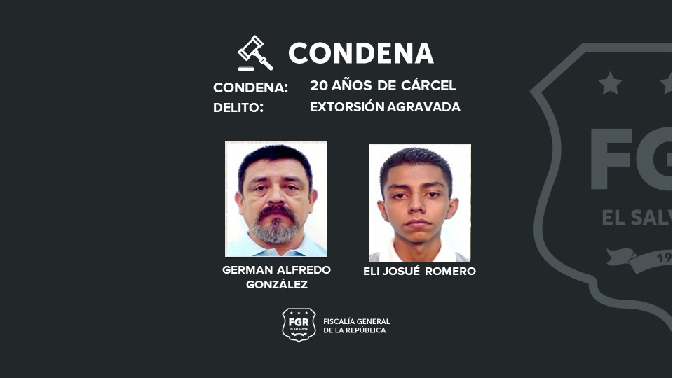 La Fiscalía General de la República (FGR), informó mediante redes sociales, la condena de 20 años de cárcel a German González y Elí Romero por extorsionar a un comerciante en San Miguel.