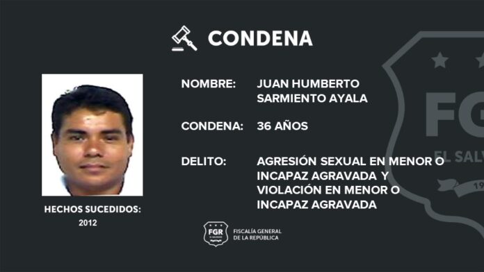La Fiscalía General de la República (FGR), informó sobre la condena de Juan Humberto Sarmiento Ayala a 36 años de cárcel, por violar a una niña, hechos ocurridos en Ahuachapán.