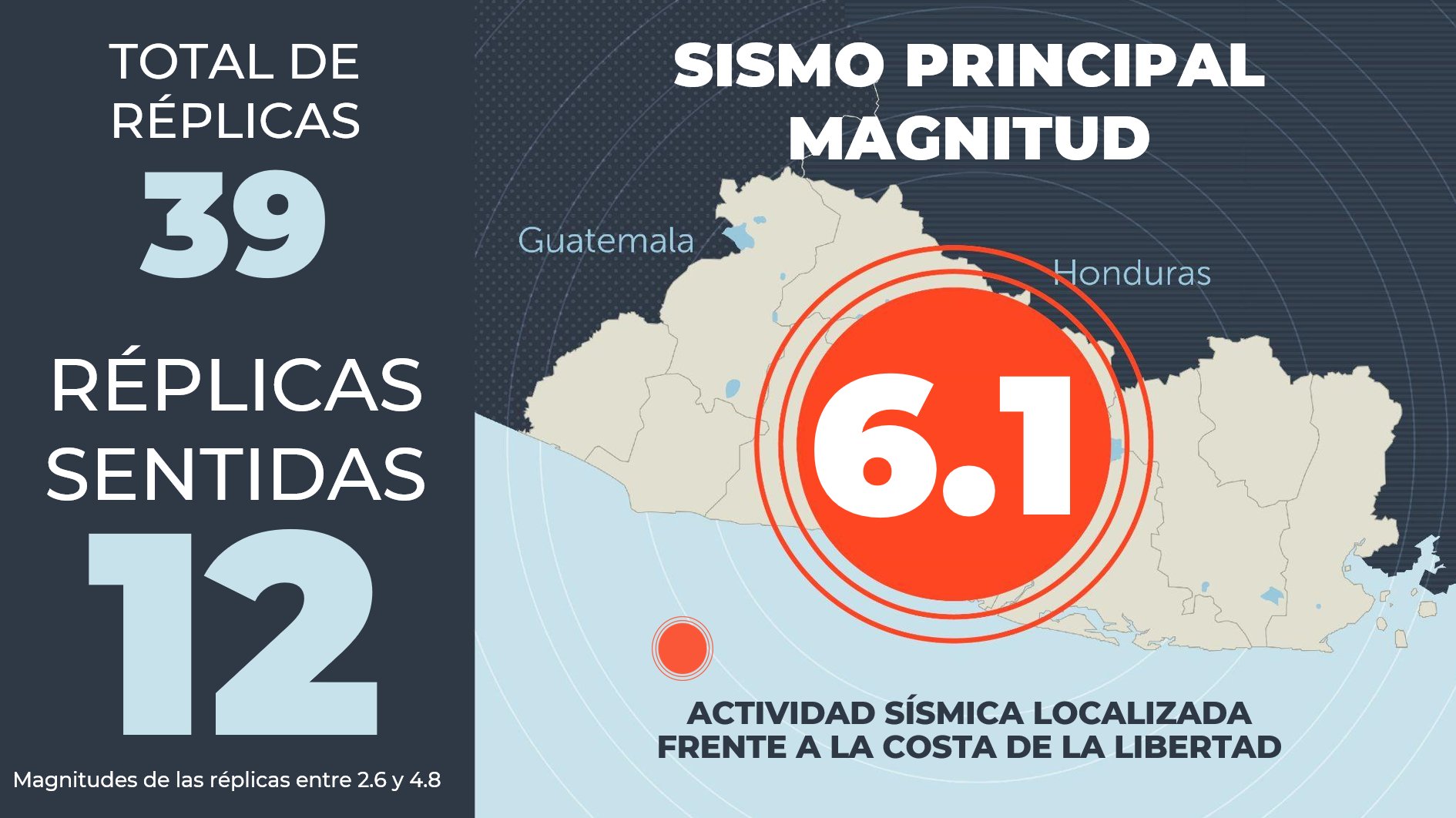 Destacando, el MARN informó que de las 39 réplicas que se han registrado, solamente 12 de ellas han sido sentidas por la población.