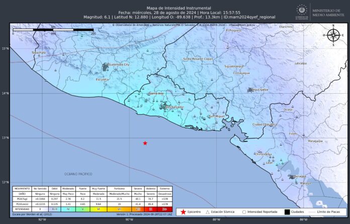 “DATOS REVISADOS: Sismo mag. 6.1, frente a costa de La Libertad. A 70.0 km al sur de Playa Mizata. Prof. 13 km. [2024-08-28, 15:57:55]. ACTUALIZACIÓN: No existe amenaza de tsunami para El Salvador”, dijo la Cartera de Medio Ambiente.