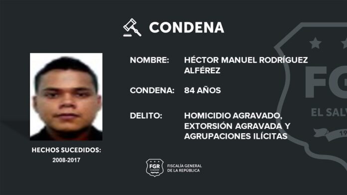 “Héctor Manuel Rodríguez Alférez, corredor de la MS, ha sido condenado a 84 años de prisión por los delitos de extorsión, homicidio agravado y agrupaciones ilícitas. Otros pandilleros también recibieron penas carcelarias de 65, 44 y 33 años”, mencionó la FGR.