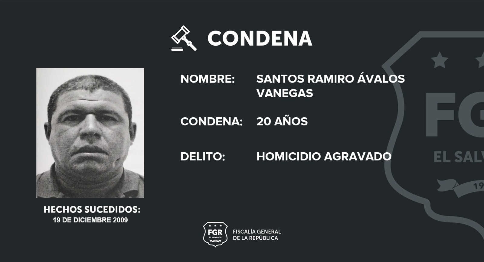La Fiscalía General de la República (FGR), informó por medio de redes sociales sobre la condena de 20 años de prisión, para Santos Ramiro Ávalos Vanegas, quien cometió el delito de homicidio agravado.