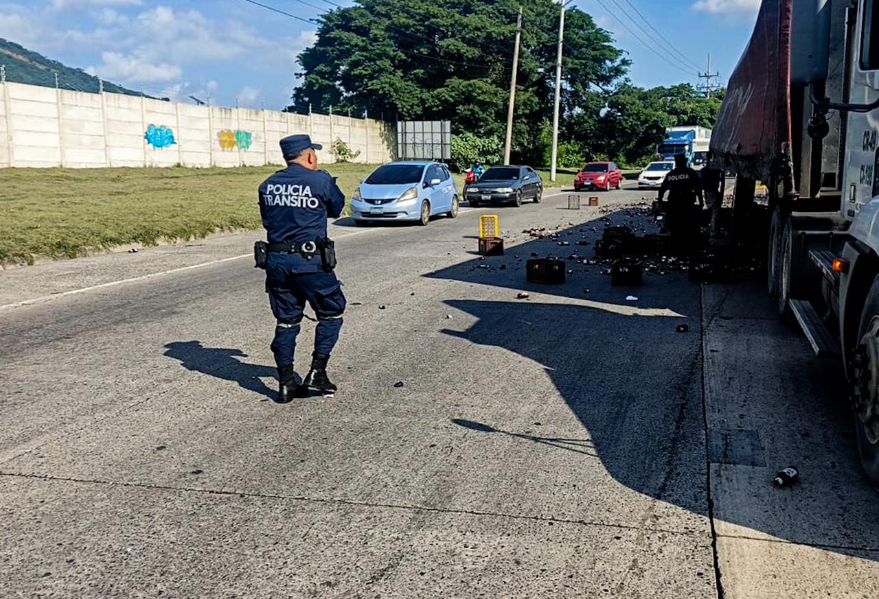 De acuerdo a la Policía Nacional Civil, el hecho ocurrió cuando el conductor de una rastra hizo una mala maniobra y botó varias cajas de bebidas sobre la carretera.