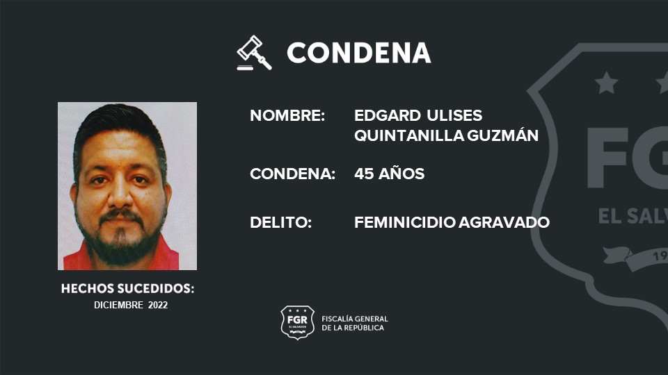 “Edgard Quintallina fue condenado a 45 años de cárcel por asesinar a su compañera de vida luego de dispararle con un arma de fuego”, dijo la FGR.