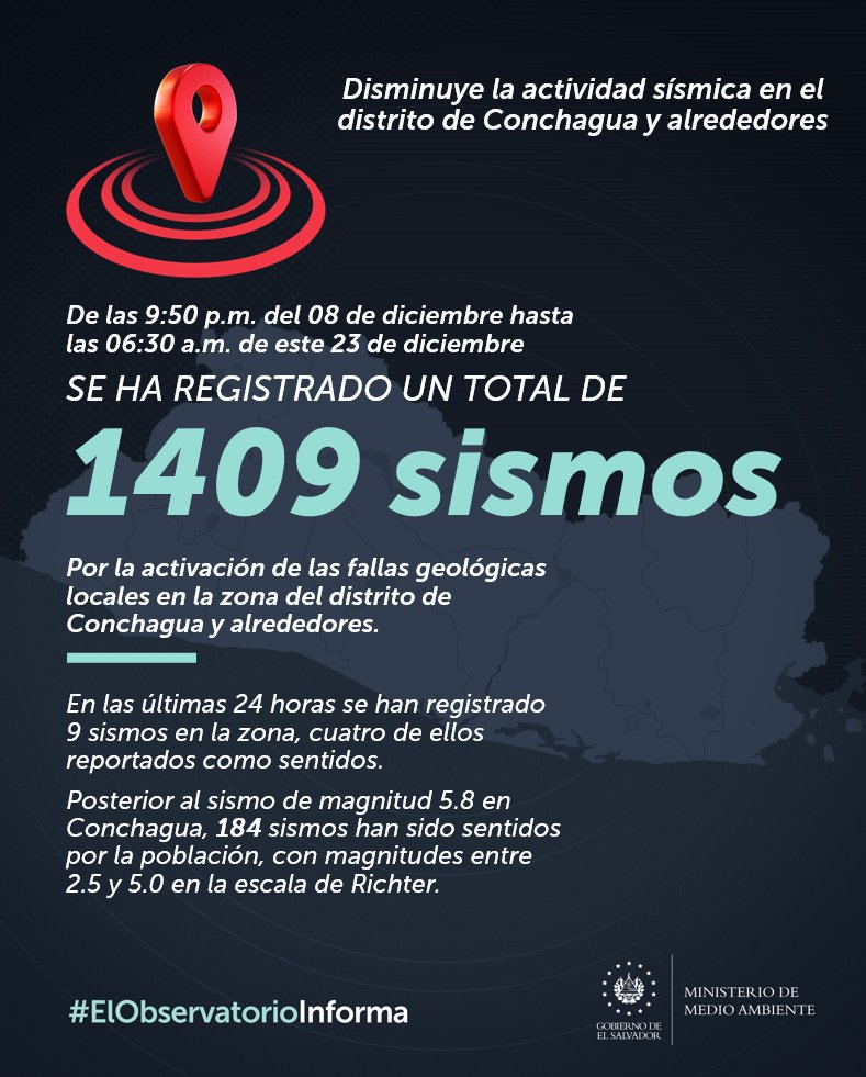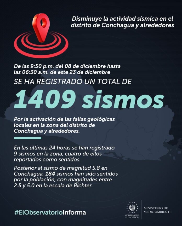 El Ministerio de Medio Ambiente y Recursos Naturales (MARN), manifestó que se han registrado 1,409 réplicas, tras la ocurrencia del sismo de magnitud 5.8 a las 9:50 p.m. del 8 de diciembre.