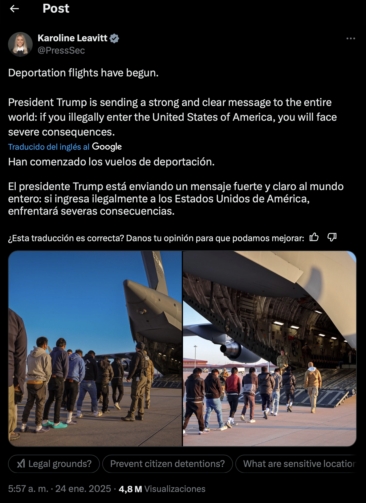 Los migrantes suelen ser esposados antes de subir a los vuelos de deportación. Sin embargo, el uso de aviones militares para enviarlos a su país de origen es notable. No está claro de dónde procedían los migrantes, pero se cree que eran personas que habían cruzado la frontera recientemente y estaban bajo custodia de la Patrulla Fronteriza.