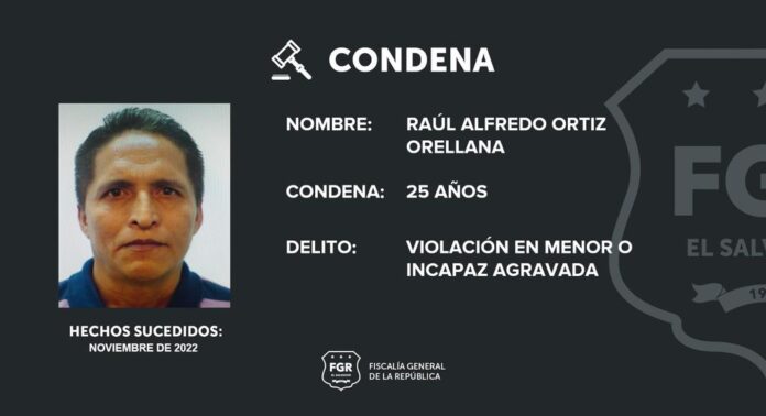“Raúl Orellana fue condenado a 25 años de cárcel por violar a una menor de edad en el distrito de Ciudad Delgado, San Salvador”, mencionó la FGR.