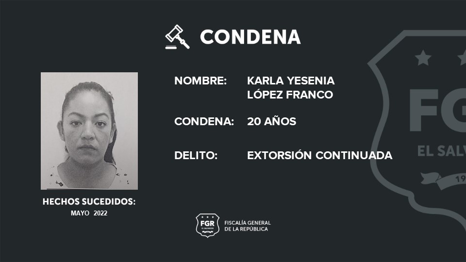 “Karla Yesenia López Franco cometió el delito de extorsión continuada y la Fiscalía General de la República logra que sea condenada a 20 años de prisión”