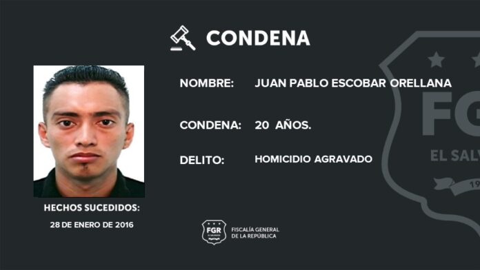 “Juan Pablo Escobar Orellana ha sido condenado a 20 años de prisión por participar en el asesinato de un hombre en San Miguel”, dijo la FGR.