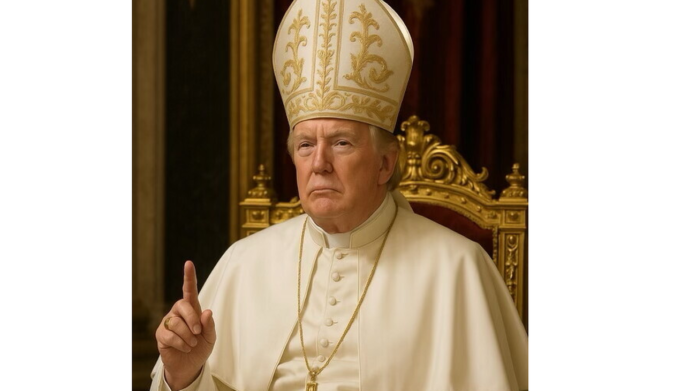 La foto a color difundida por Trump lo muestra sentado con aire solemne en un sillón, vestido con la sotana blanca papal, coronado con la mitra y luciendo la imponente cruz de oro. Tiene la mano izquierda apoyada en el muslo y el índice derecho levantado hacia el cielo.