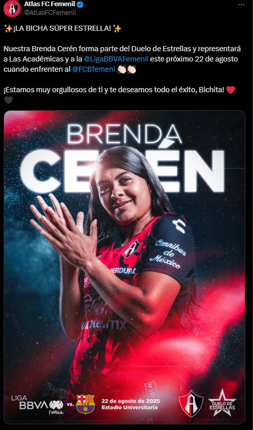 Atlas FC la ha destacado como su única representante, calificándola de “La Bicha súper estrella”, recalcando el honor que representa para el club.