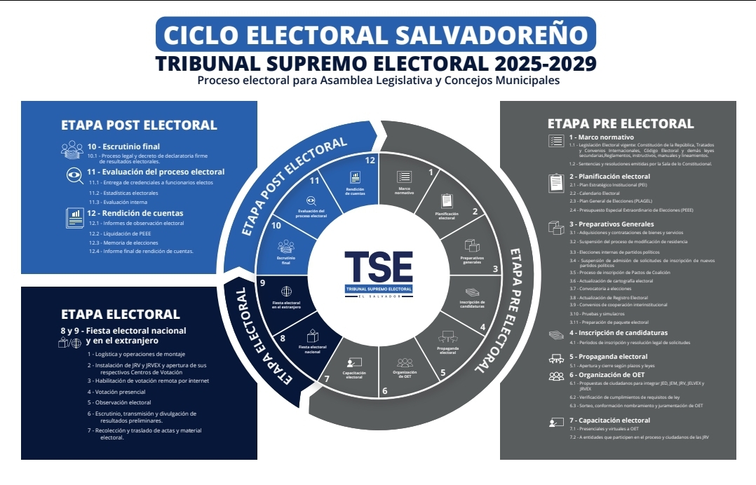 El Ciclo Electoral Salvadoreño está compuesto por tres grandes etapas —preelectoral, electoral y poselectoral— integradas por 12 fases interconectadas, diseñadas para asegurar la confianza pública en cada uno de los resultados.