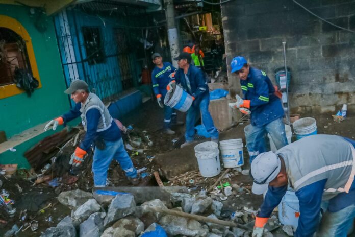 Por tercer día consecutivo, la Alcaldía de San Salvador mantiene desplegadas cuadrillas municipales en labores de remoción de escombros en diferentes puntos de la capital, luego de las inundaciones ocasionadas por las fuertes lluvias del pasado viernes.