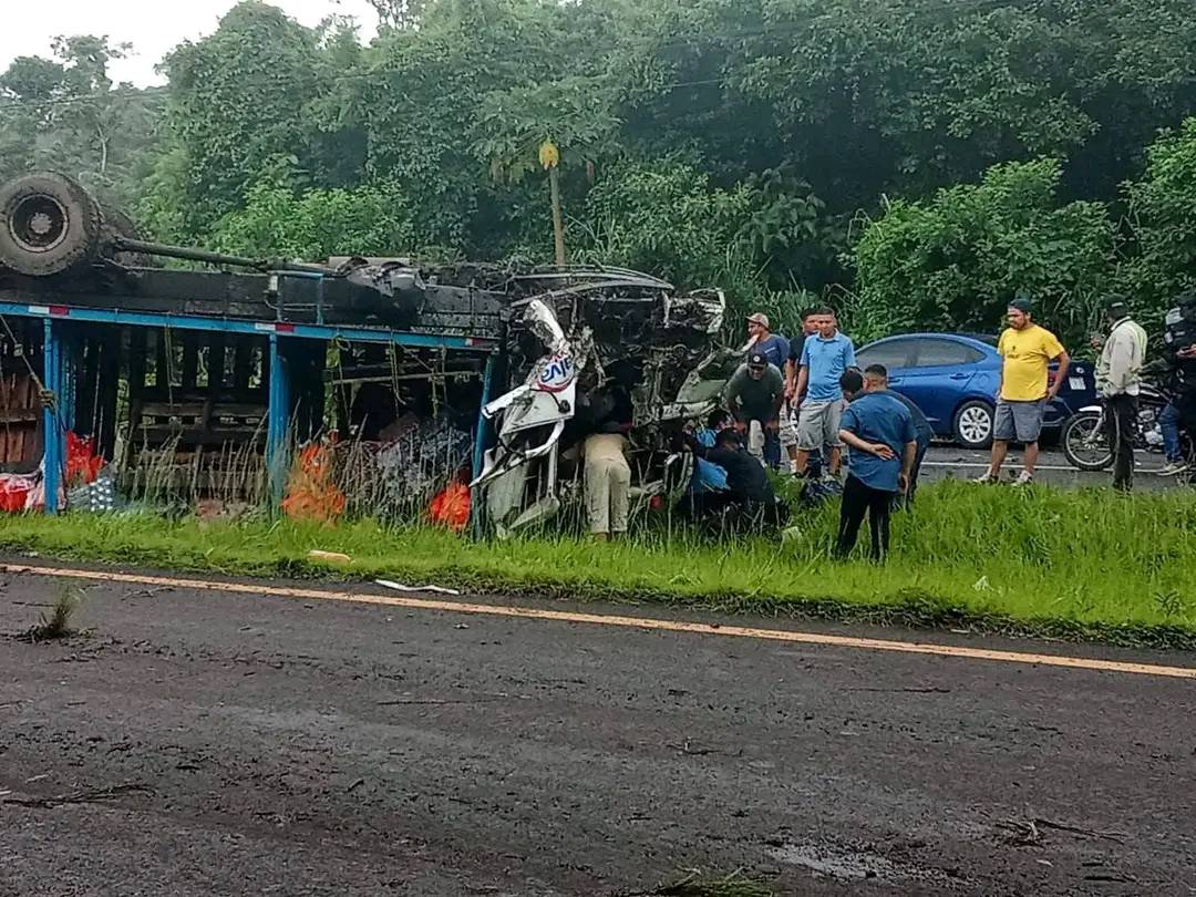 Un camión que transportaba bebidas embotelladas se salió de la carretera, chocando contra un árbol y volcó. Según la Policía Nacional Civil (PNC), el conductor manejaba a excesiva velocidad lo que provocó que se saliera de la vía.