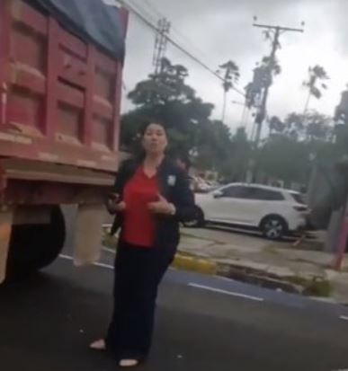 En las imágenes difundidas se observa cómo la mujer, identificada únicamente por la placa de su vehículo particular P704-776, golpea al conductor de la volqueta, lo amenaza con denunciarlo a la policía y trata de arrebatarle el teléfono celular.