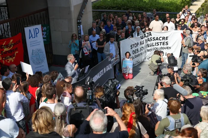 Durante la concentración los organizadores leyeron los nombres de los periodistas palestinos muertos desde que comenzó el conflicto el 7 de octubre de 2023, tras el ataque del grupo terrorista Hamás, seguido por un minuto de silencio.