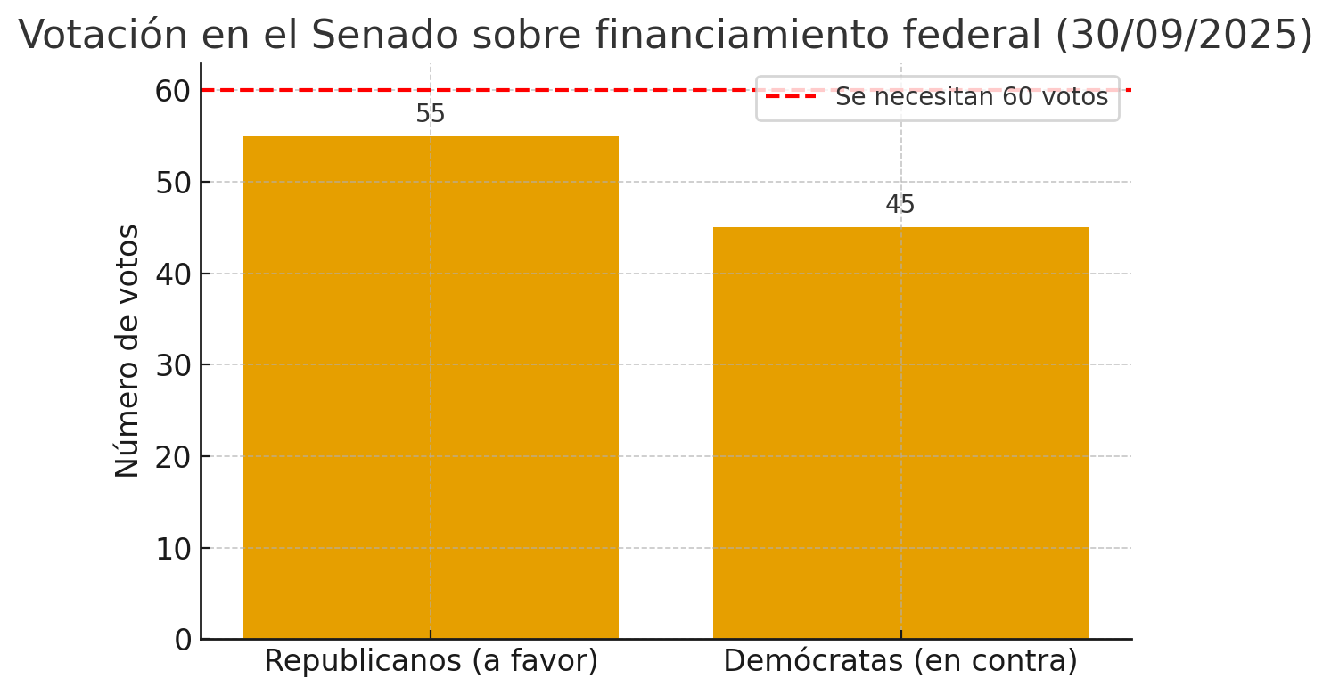 Washington, 30 de septiembre de 2025 — El gobierno de Estados Unidos se encamina a su primer cierre en casi siete años, después de que el Senado rechazara este martes un proyecto republicano para extender el financiamiento federal.