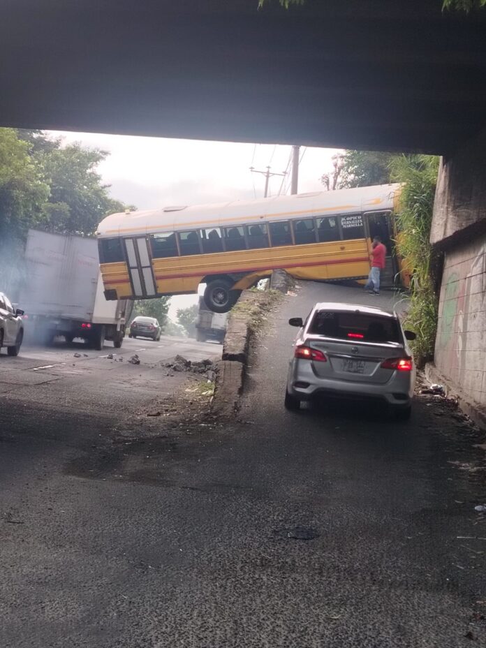 Un autobús quedó parcialmente suspendido en el vacío tras accidentarse sobre el puente San José, en la carretera Panamericana, a la altura de Soyapango. Autoridades mantienen el paso habilitado mientras se realizan los trabajos de remoción del vehículo.