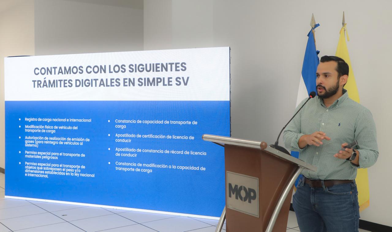 El titular mencionó que a través de la plataforma de simple.sv ya se puede realizar el registro de carga nacional e internacional, modificación física del vehículo de transporte de carga, autorización de realización de emisión de gases (para reintegro de vehículo al sistema), permiso especial para el transporte de materiales peligrosos.