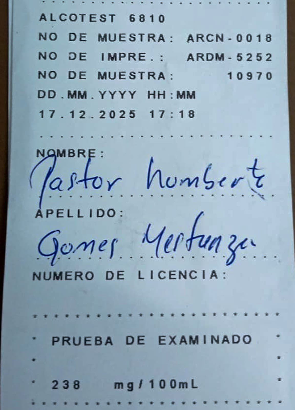 «Pastor Humberto Gómez Mestanza, con 238° de alcohol, manejaba un bus de la R 30B. Fue intervenido cuando realizaba maniobras imprudentes sobre la calle antigua a Soyapango, de oriente a poniente, en Ciudad Delgado, San Salvador Centro», dijo la PNC.