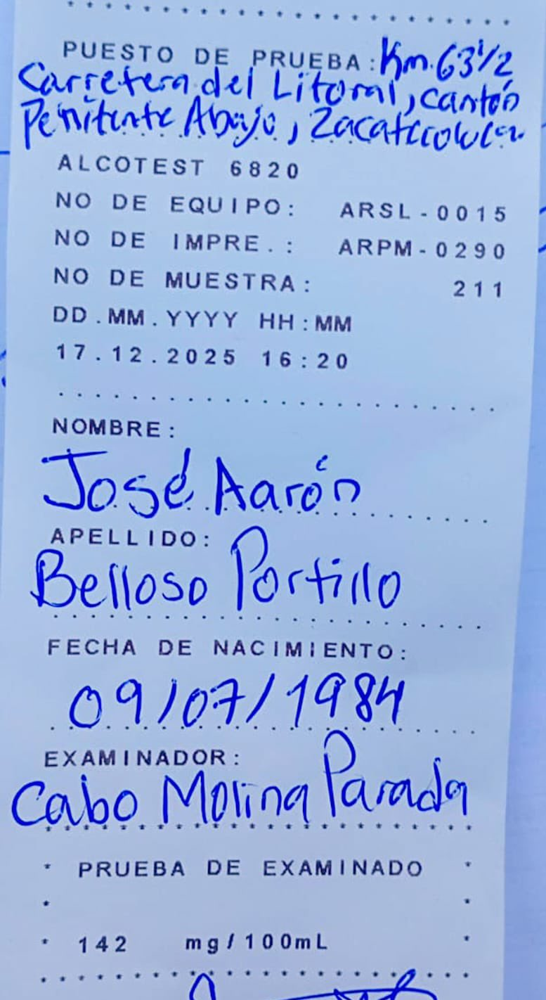 Aparte de Gómez Mestanza, la PNC capturó a José Arón Belloso Portillo, con 142° de alcohol, quien se accidentó en una motocicleta sobre el km 63 ½ de la carretera Litoral, en el desvío a Ichanmichen, en Zacatecoluca, La Paz Este.