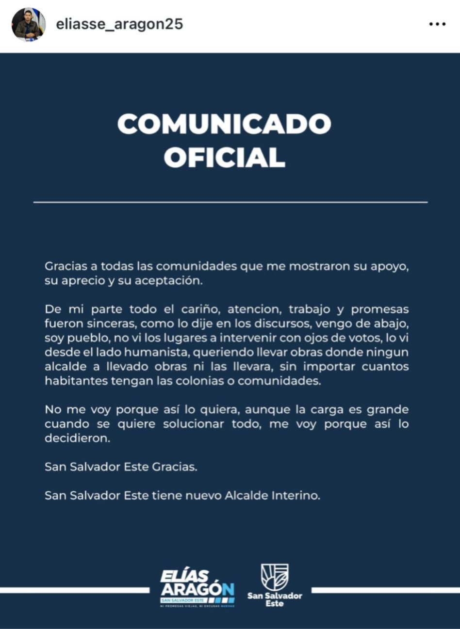 “San Salvador Este, gracias por permitirme servirte”, concluyó en su mensaje. Con este anuncio, se confirmó que el municipio contará ahora con un nuevo alcalde interino.