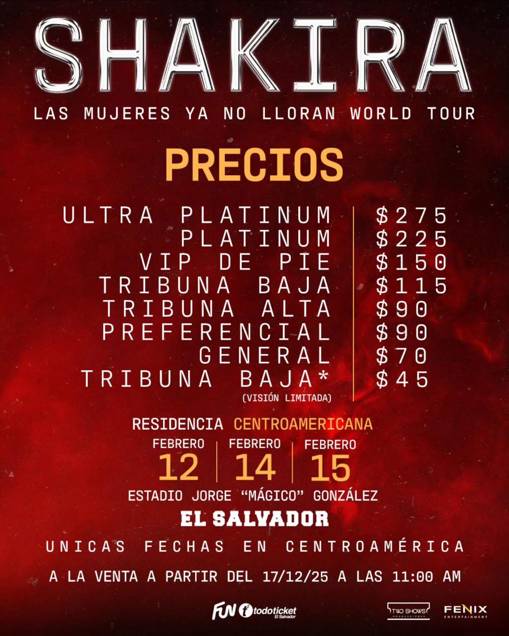 La productora a cargo de los conciertos de Shakira en El Salvador dio a conocer los precios oficiales de las localidades para sus tres presentaciones programadas los días 12, 14 y 15 de febrero en el Estadio Jorge “Mágico” González, como parte de su gira “Las Mujeres Ya No Lloran World Tour”, las únicas fechas anunciadas en Centroamérica.