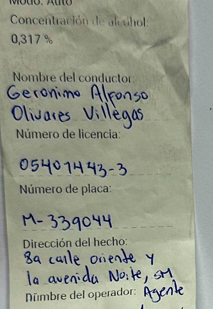 «Gerónimo Alfonso Olivares Villegas manejaba en estado de ebriedad y ocasionó un accidente de tránsito sobre la 4ª avenida Norte y 8ª calle oriente, en San Miguel, durante la madrugada», mencionó la PNC en redes sociales.