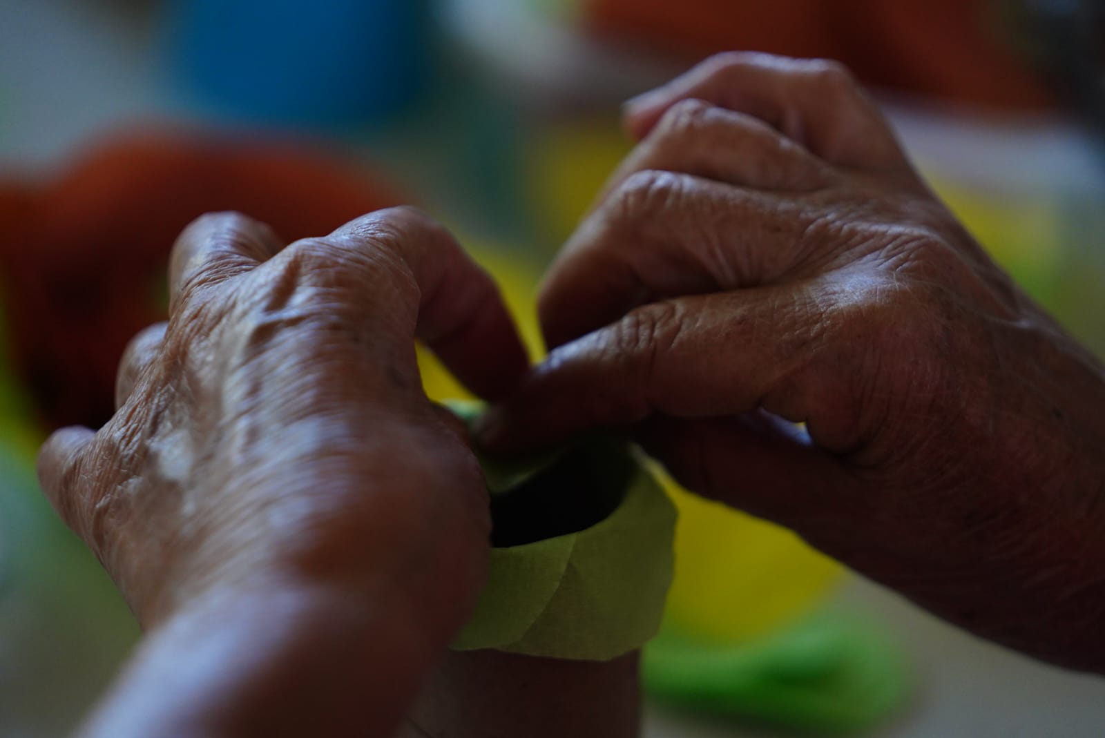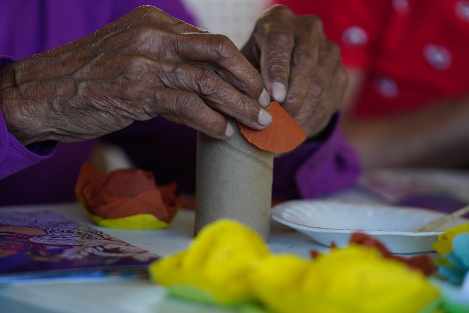 Adultos Mayores de la colonia Tazumal 2, en el Distrito de Chalchuapa, participan en el taller para la elaboración de flores de papel, con el objeto de fortalecer las habilidades psicomotrices.