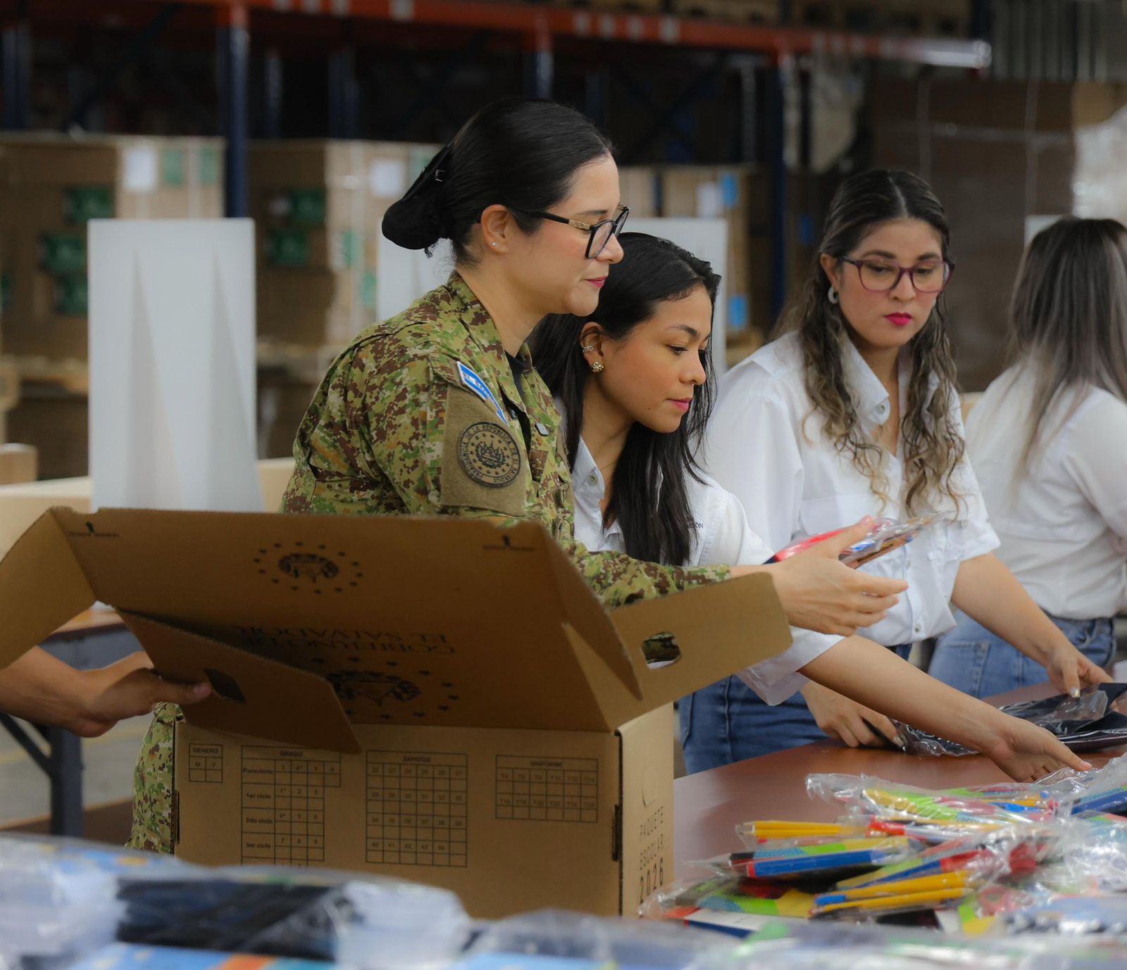 La ministra de Educación, Karla Trigueros, supervisó este lunes la preparación de los paquetes escolares que serán entregados gratuitamente a estudiantes del sistema público, desde las bodegas del Ministerio de Gobernación, ubicadas en Soyapango, como parte del inicio del año escolar.