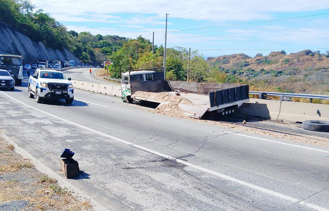 Otro accidente se registró en el kilómetro 34 de la carretera que conecta San Salvador con Santa Ana, en el distrito de Ciudad Arce. En este hecho, un camión que transportaba cajas de manteca y harina perdió el control y volcó tras colisionar con otro vehículo que, según el informe policial, se incorporó de forma imprudente a la vía.