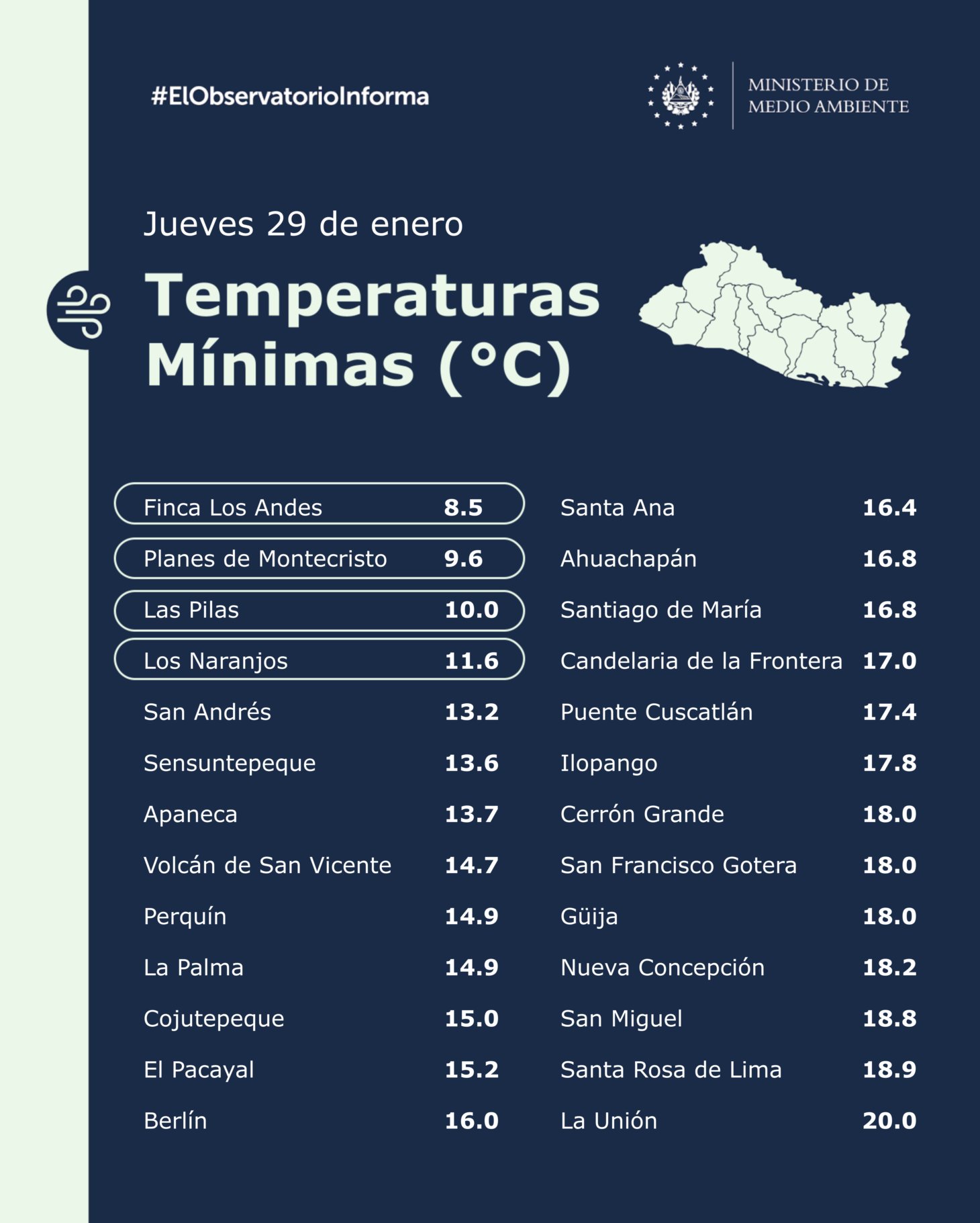 En las primeras horas de este jueves, la temperatura descendió hasta los 8.5 ºC en Finca Los Andes, Santa Ana y en las últimas horas, se ha registrado vientos de hasta 47.2 km/h en Ishuatán, Sonsonate.