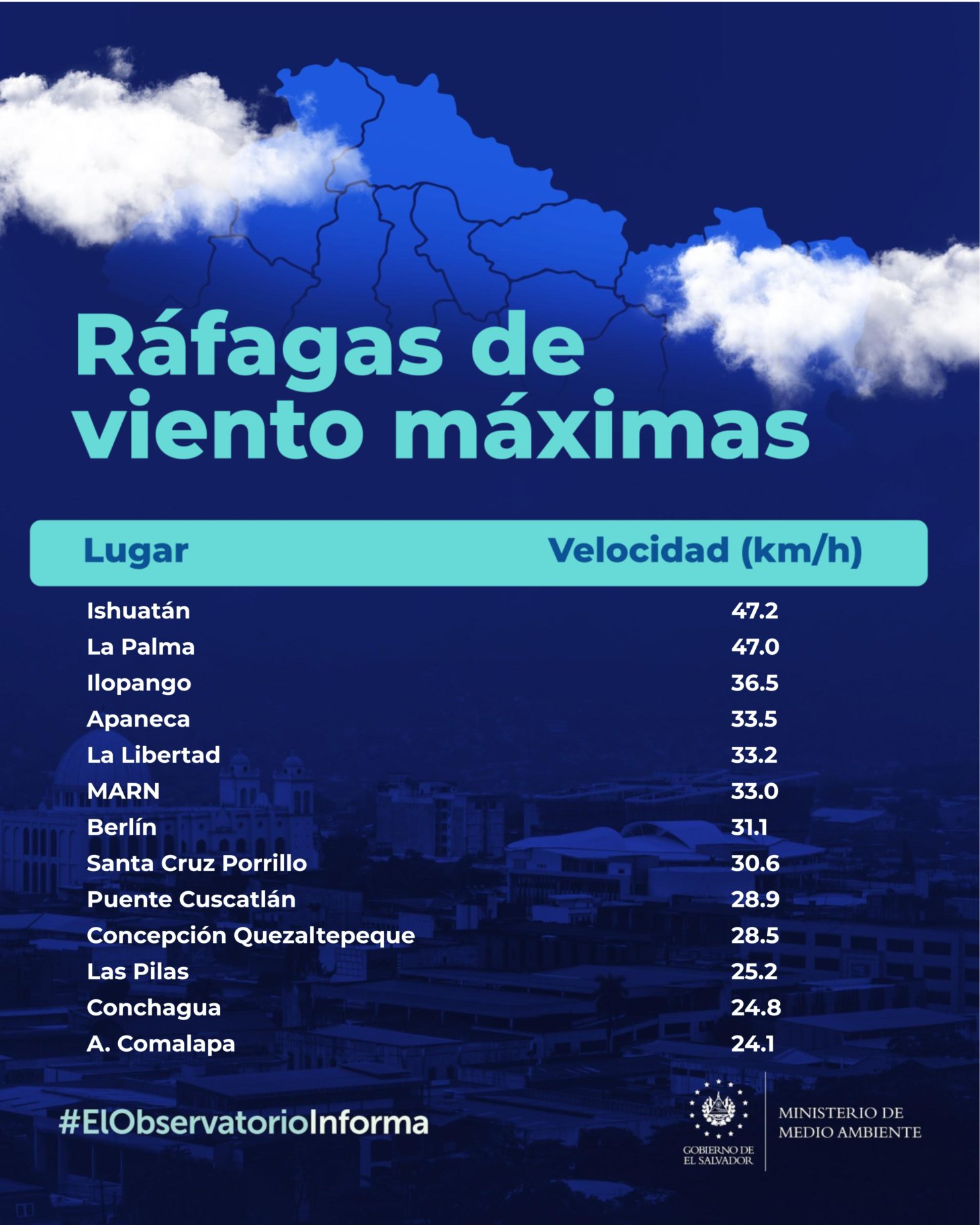El Ministerio de Medio Ambiente y Recursos Naturales (MARN), reporto que se mantienen se mantienen los Vientos Nortes, con ráfagas que pueden alcanzar hasta 50 km/h, con énfasis en zonas del norte, oriente y paracentral.