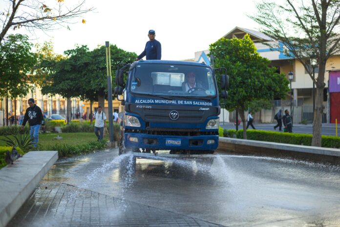 La Alcaldía de San Salvador Centro informó que Desechos Solidos realizó labores de lavado y saneamiento en la Plaza Las Banderas y en los alrededores de la iglesia El Calvario.