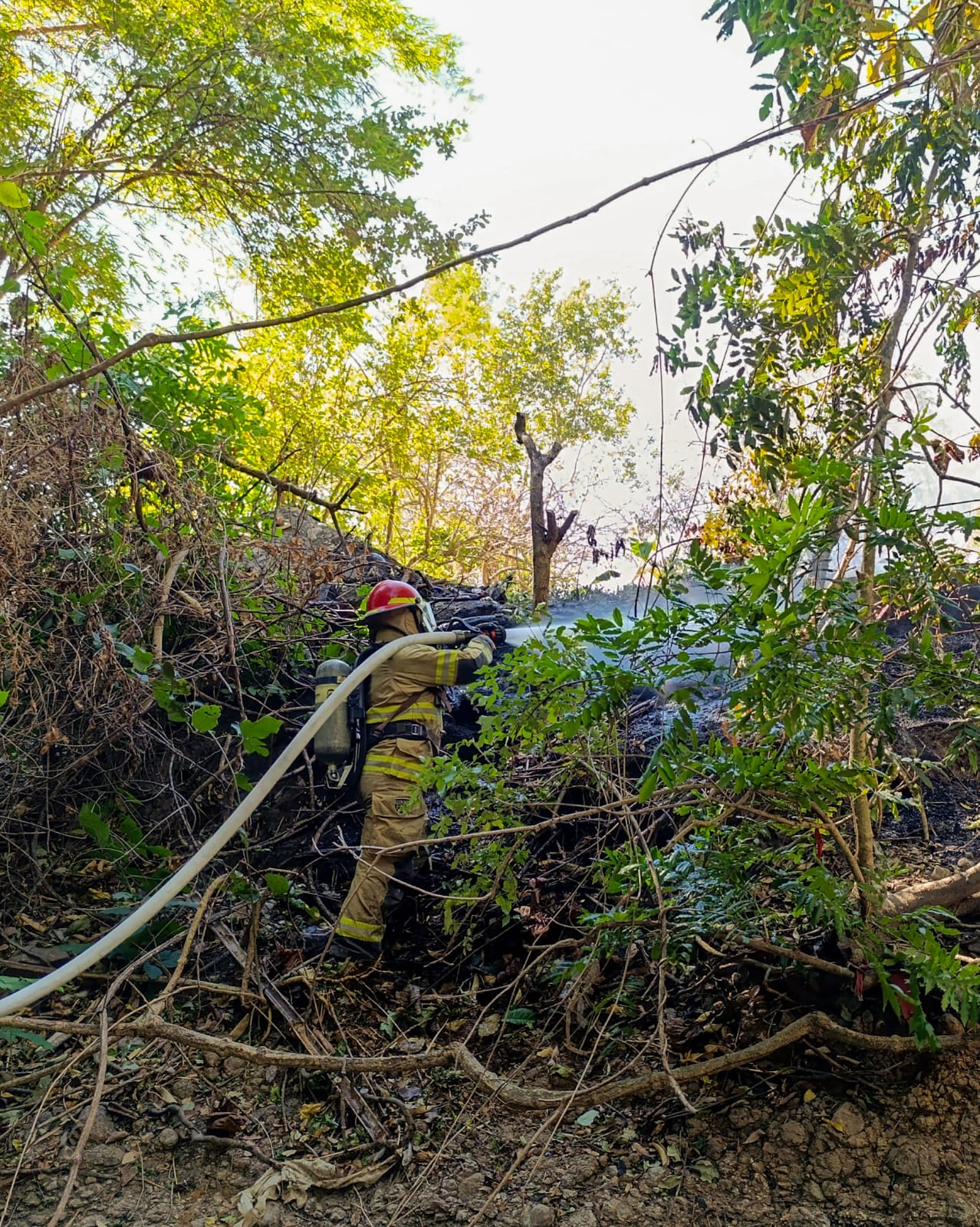 Cuerpo de Bomberos extinguió un incendio registrado en un terreno con abundante maleza seca, hojarasca y llantas en desuso, ubicado en el caserío El Cacao, cantón San José Arriba, distrito de Santiago Nonualco, La Paz Centro.