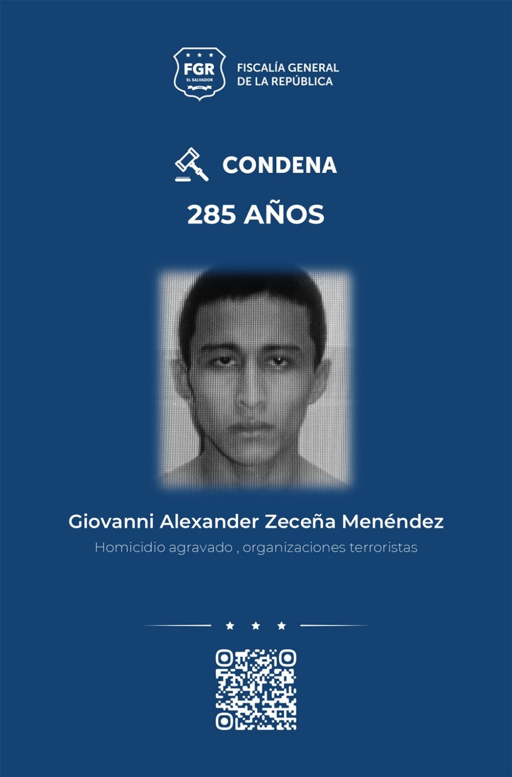 La Fiscalía General de la República informó que Giovanni Alexander Zeceña Menéndez, miembro de la MS, fue condenado a 285 años de prisión por seis homicidios y el delito de organizaciones terroristas.