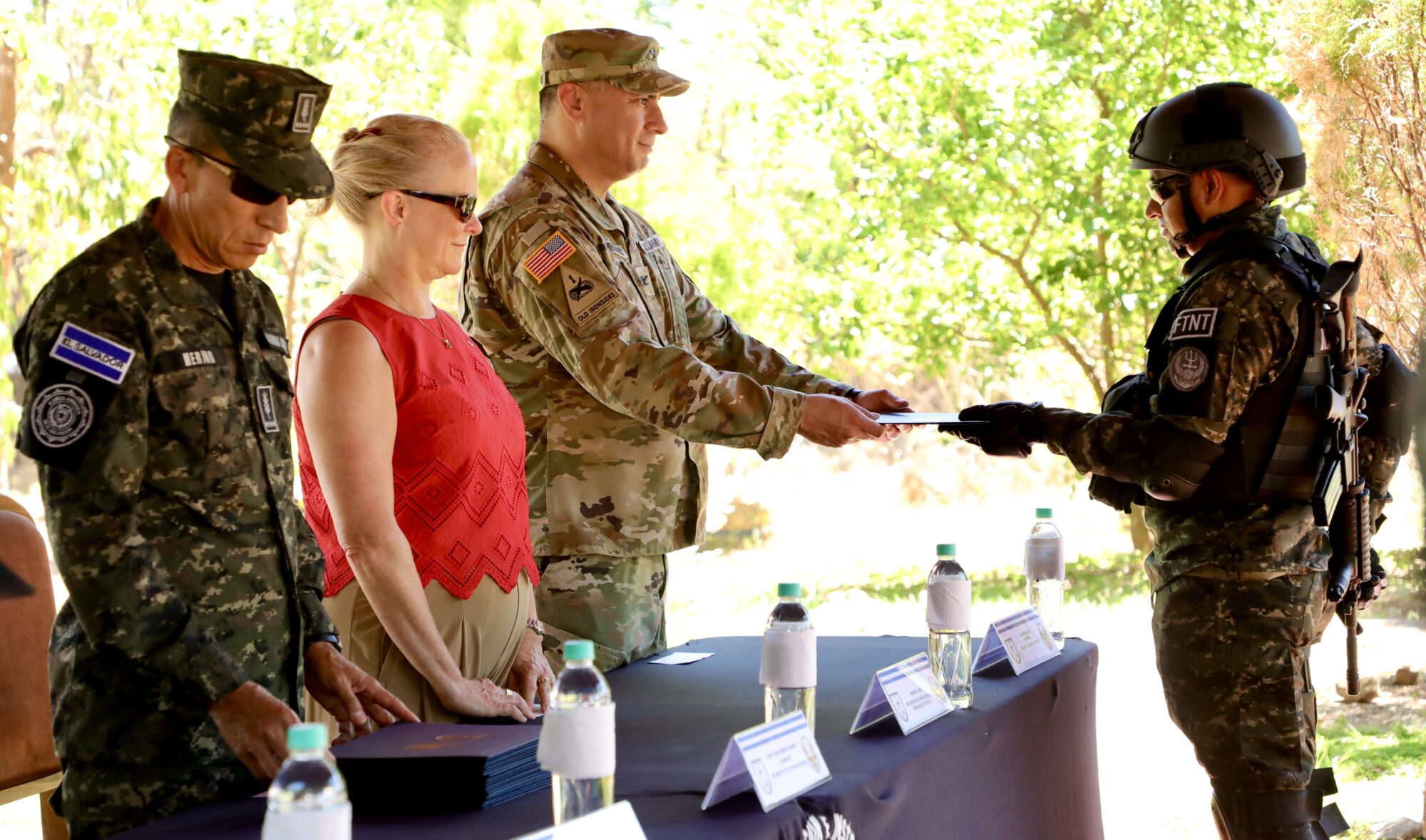 Hoy, la Fuerza Tarea Naval de Tridentes (FTNT) celebró la graduación de 26 nuevos integrantes, quienes completaron exitosamente un riguroso curso de entrenamiento impartido por operadores de la Fuerza Especial Naval de la Armada de Los Estados Unidos (U.S. Navy SEALs). Sra. Naomi Fellows, la Encargada de Negocios de la Embajada de los Estados Unidos, y Admiral René Francis Merino Monroy, el Ministro de Defensa de El Salvador presidieron la ceremonia.