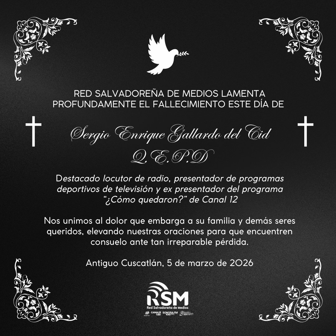 La Red Salvadoreña de Medios (RSM) informó este jueves sobre el fallecimiento de Sergio Enrique Gallardo del Cid, destacado locutor de radio y presentador de programas deportivos en televisión.